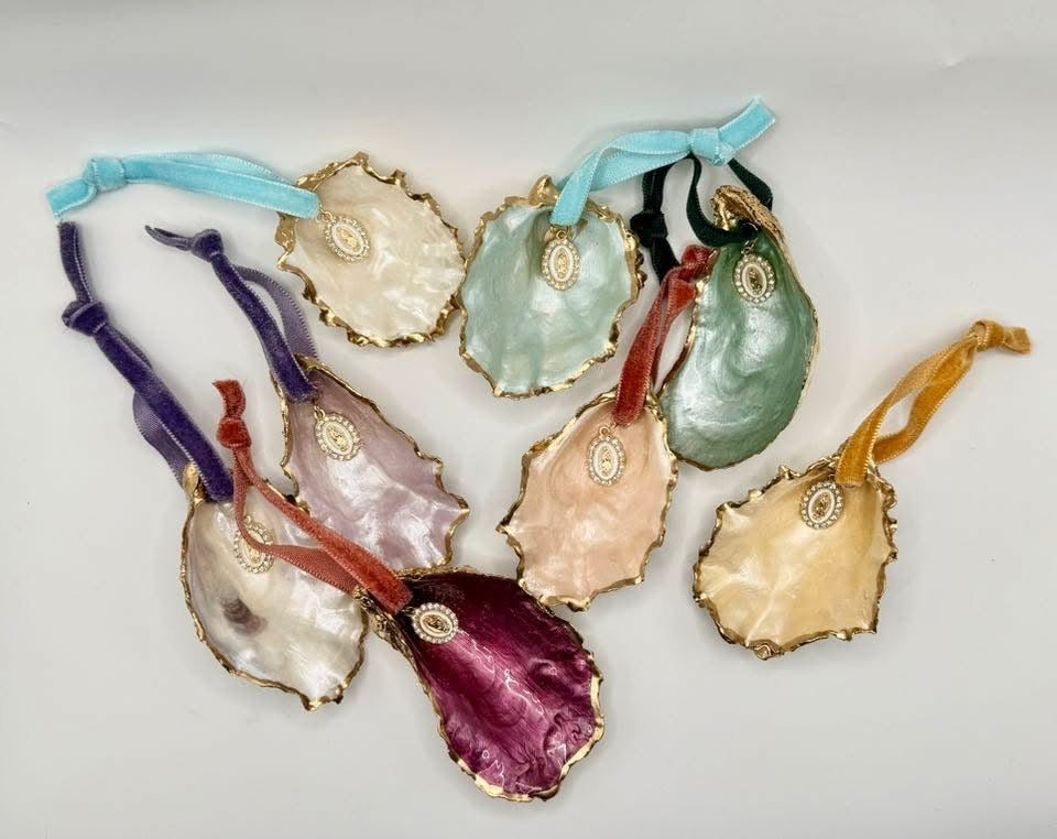 Hand painted oyster shell ornament adorned with a Mary charm and strung by a ribbon.Ā